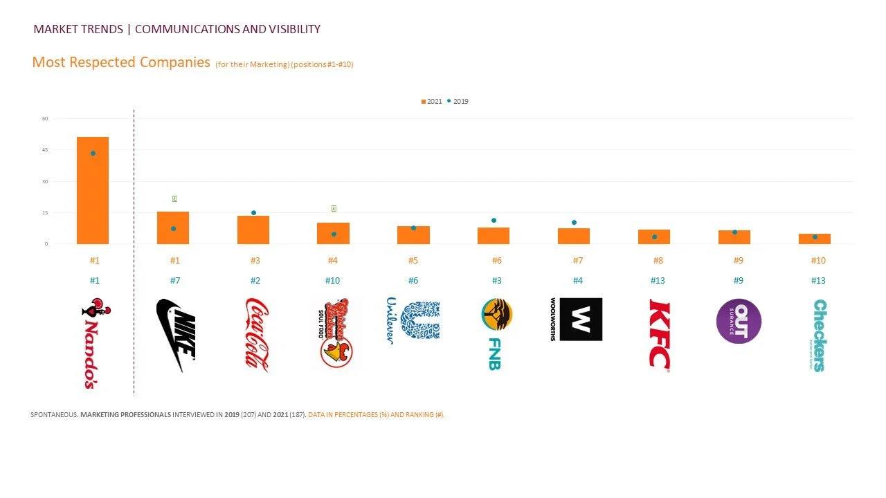 Co-founder and global CEO of Scopen International, Cesar Vacchiano, says: “I have the pleasant task of announcing the Most Respected Companies winners, led soundly by Nando’s. Nike, Coca-Cola and Chicken Licken followed by Unilever, FNB, Woolworths, KFC, OUTsurance and Checkers.