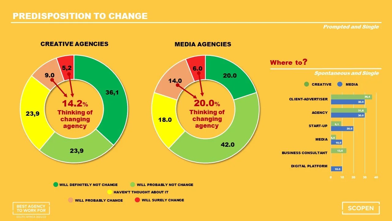The old adage holds true that change is the only certainty in life. When probing the predisposition to change, 14.2% of creative agency people and 20% of media agency personnel are thinking of moving to another agency. A reasonably high 36.1% of creatives said they would “definitely not change”, while 42% of media staffers noted that they would “probably not change”.