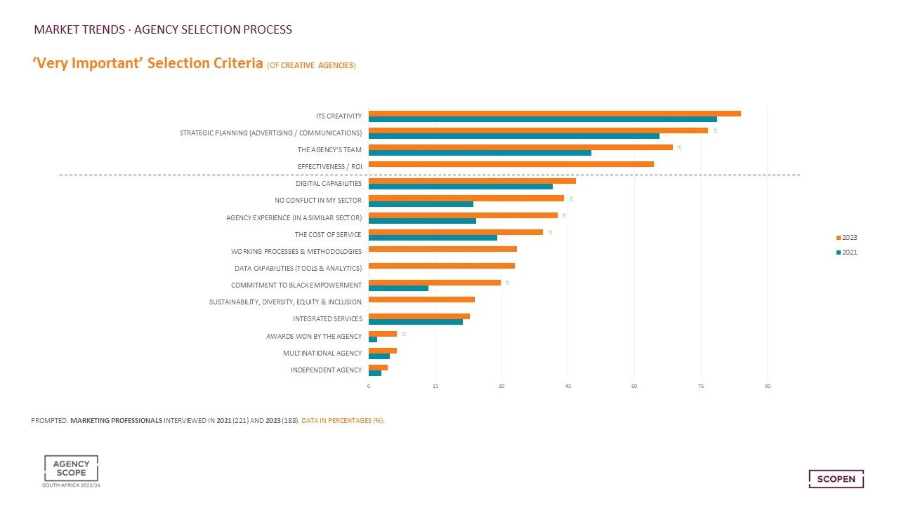 When it comes to what clients really want in agencies, the 2023/2024 Agency Scope South Africa study shows a strong uptick from the 2021/2022 study in effectiveness and return on investment; the agency’s team; and strategic planning in advertising and communications as well as creativity.