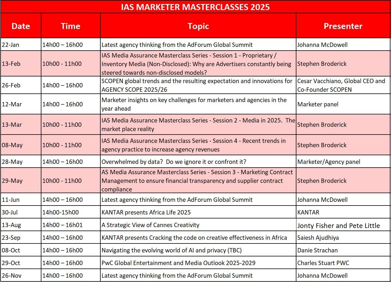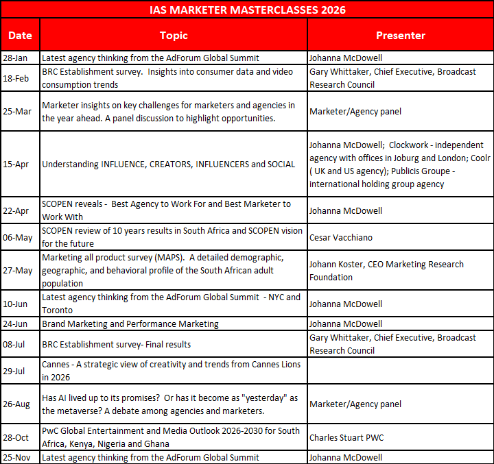 The IAS presents a series of Masterclasses each year, designed to upskill and educate around relevant and topical subjects. IAS Masterclasses are held in association with the Marketing Association of South Africa and allow for the accumulation of CPD points.